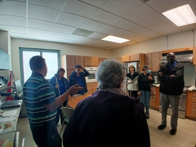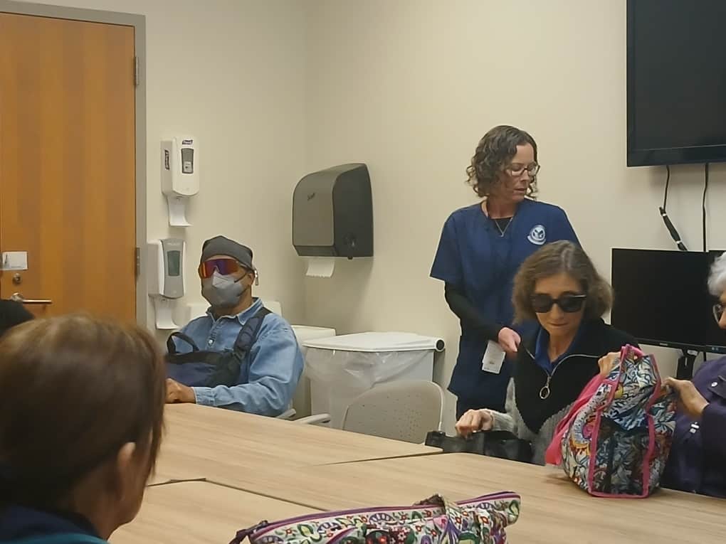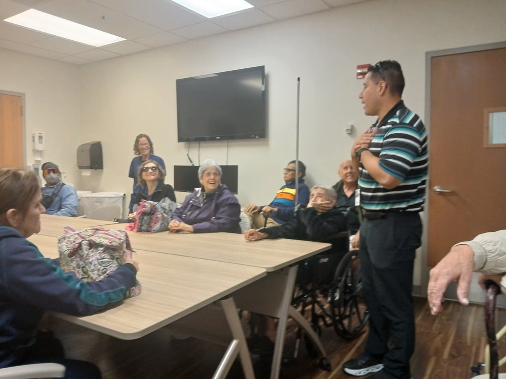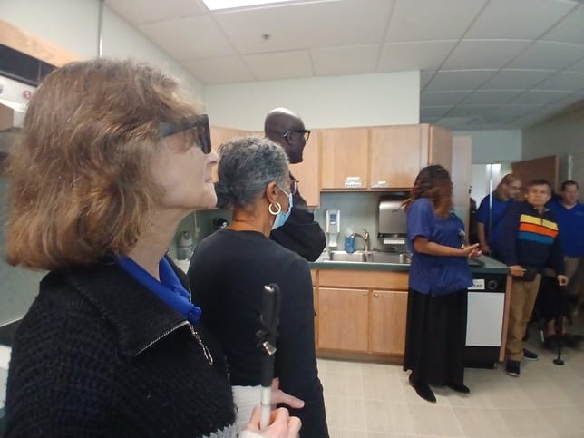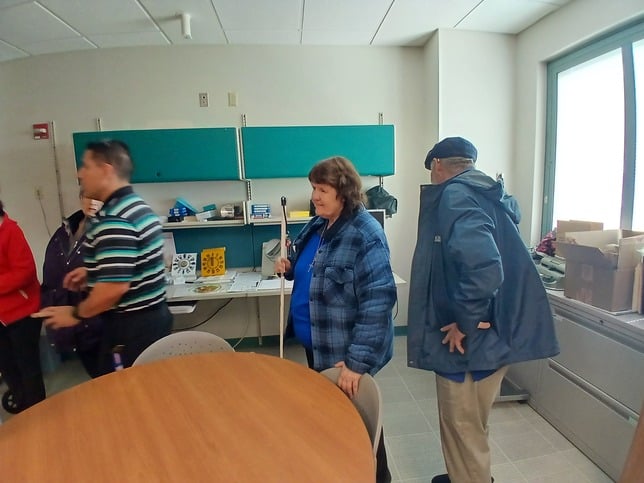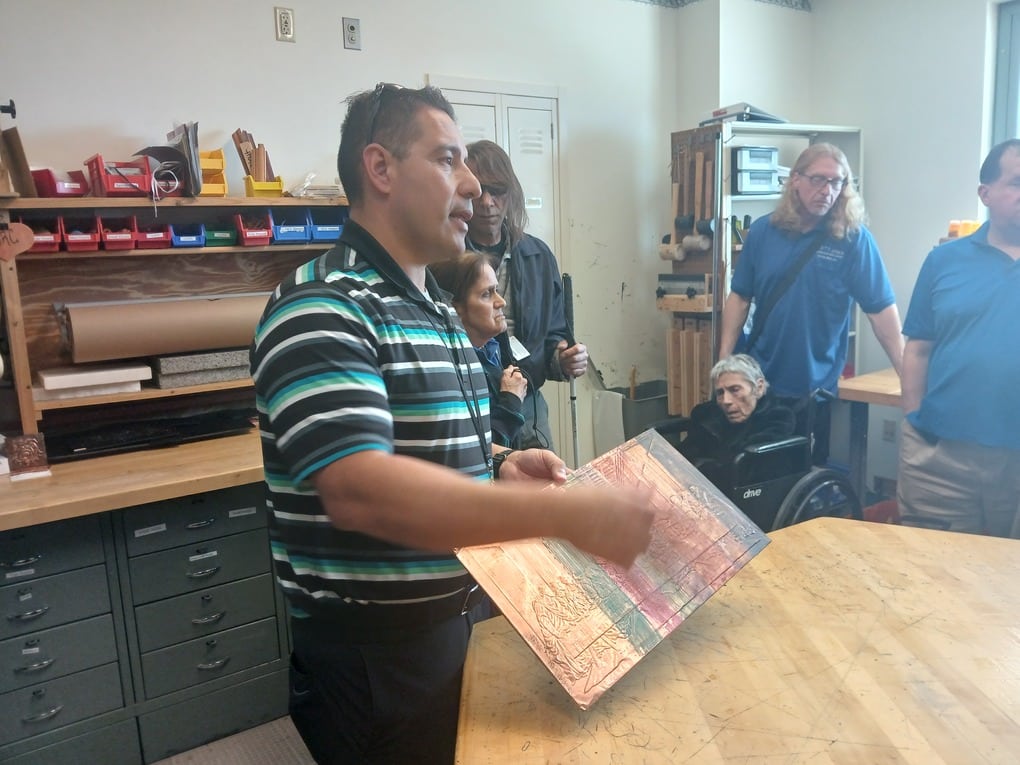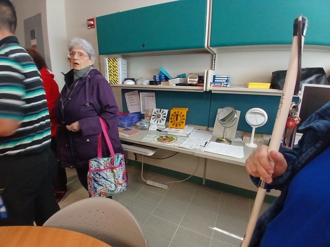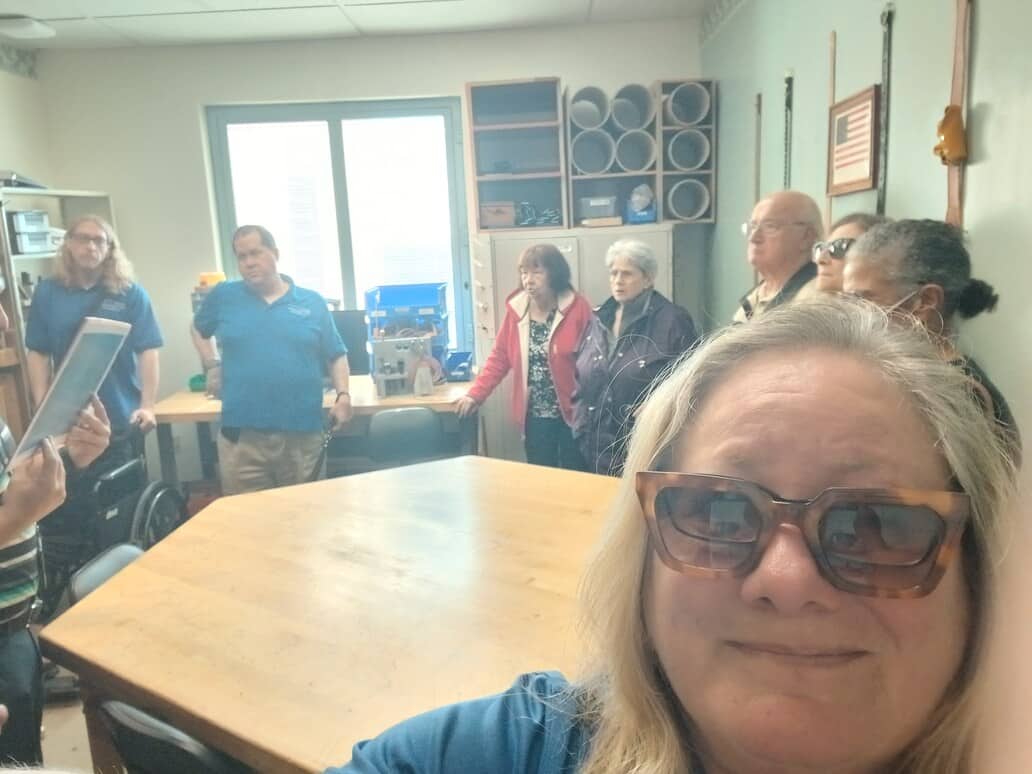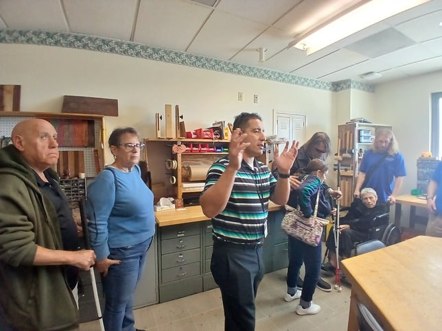 FOCB students and staff visited the VA Hospital for a tour and lecture about their amazing services for veterans who are blind or visually impaired. Gabino Lares, director of the VA’s blind services and rehabilitation programs discussed the many free things available. Then he took us on a wonderful tour of the various rooms set up for the blind to do classes in – woodworking, leather crafting, metal crafts, cooking kitchen, and so much more. A huge thank you to Gabino and staff on a great day!