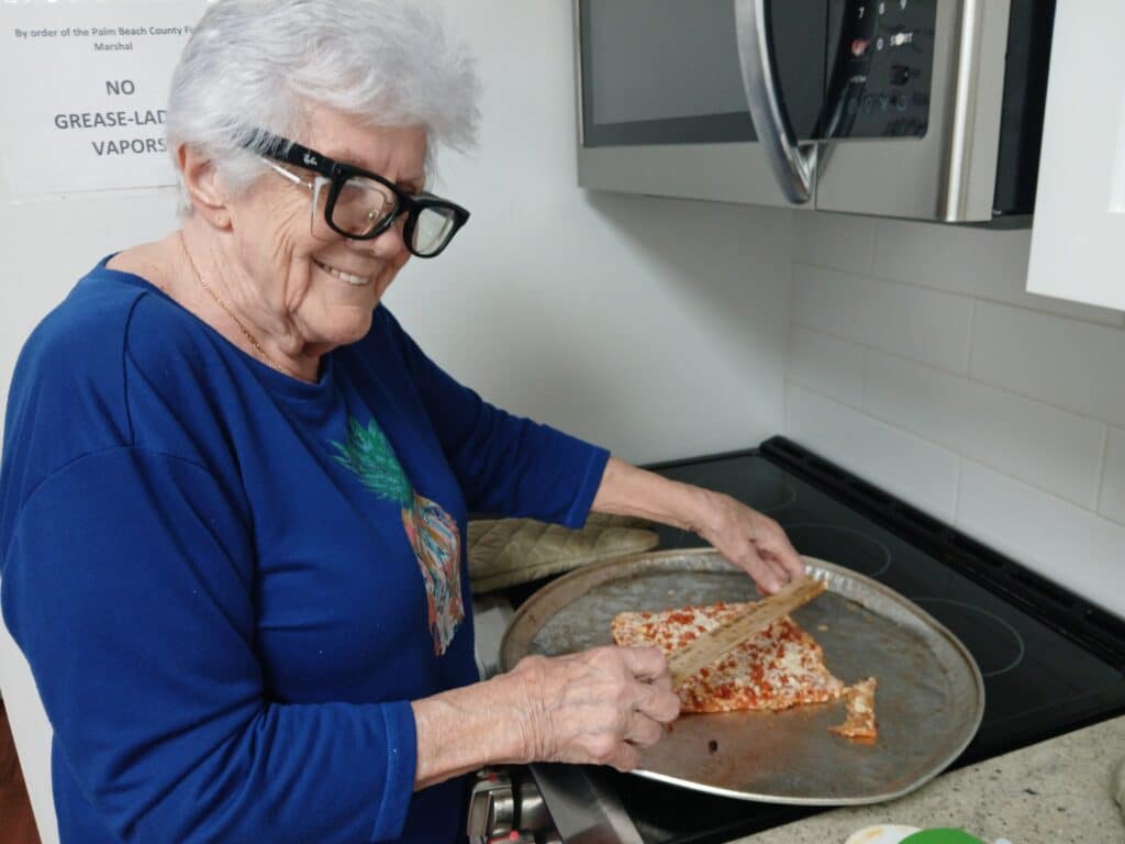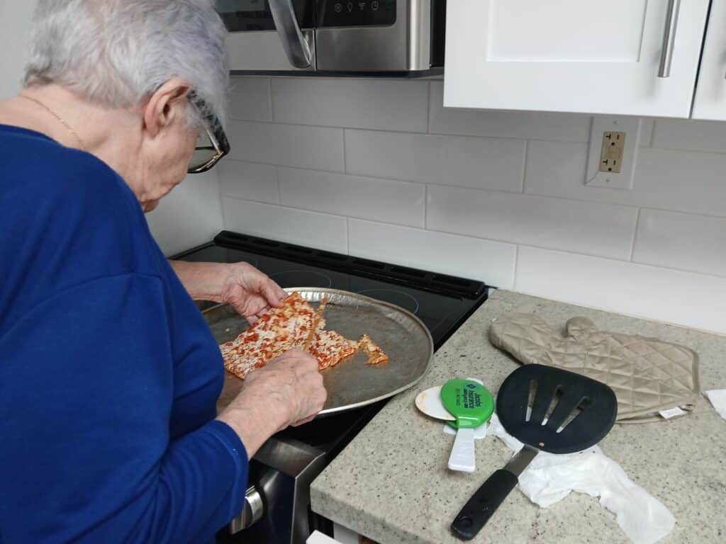 Pearl Tamlin, who is visually impaired, has been a student with FOCB for this past year and has learned so much – technology, mobility and more. Here, she is working on her Independent Living skills with Luz Norris, our IL and Braille teacher. Pearl cooked in our kitchen, making a delicious pizza. Way to go, Pearl!